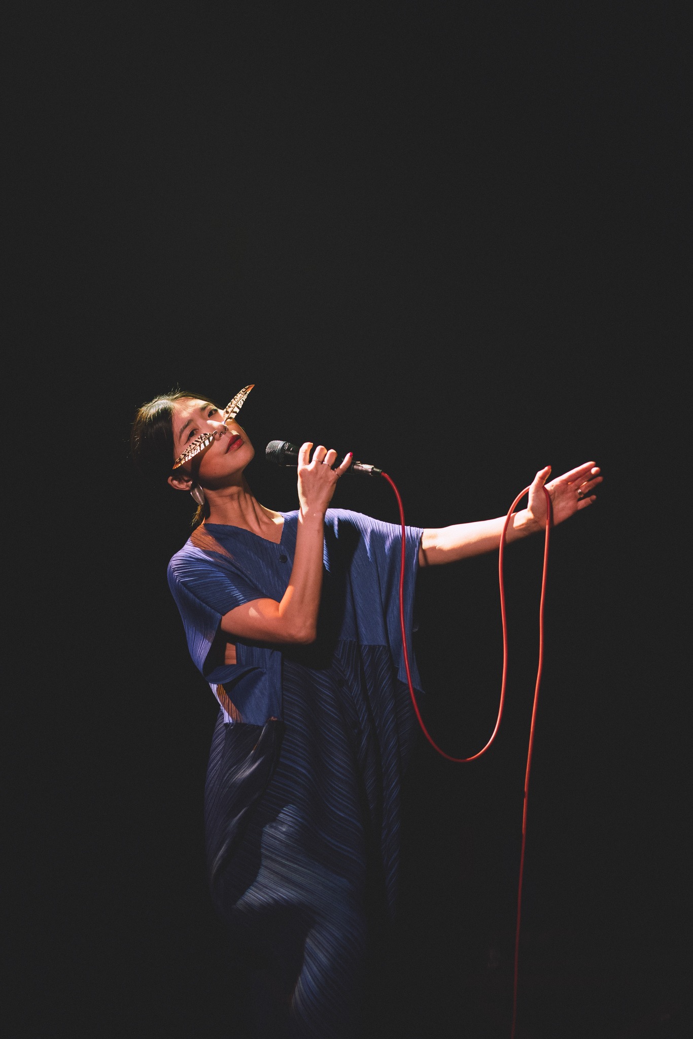 Maar dat was buiten het perfecte gevoel voor elegantie gerekend. Eerst trof de verschijning je. Gekleed in een beeldig blauwe jurk van Issey Miyake, stond ze in tegenlicht op het podium met twee veren symmetrisch op de neus. En dan was er de muziek die ze maakte. Geen pocherig gedoe, maar minimale en functionele geluiden, steeds herhaald in een lus (bestuurd met een welverzorgde teen).
